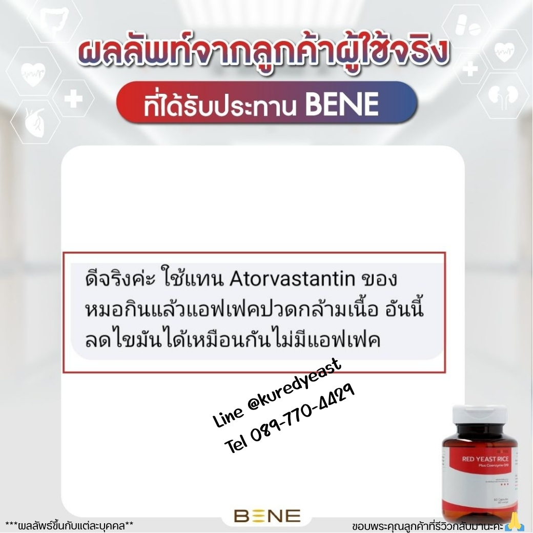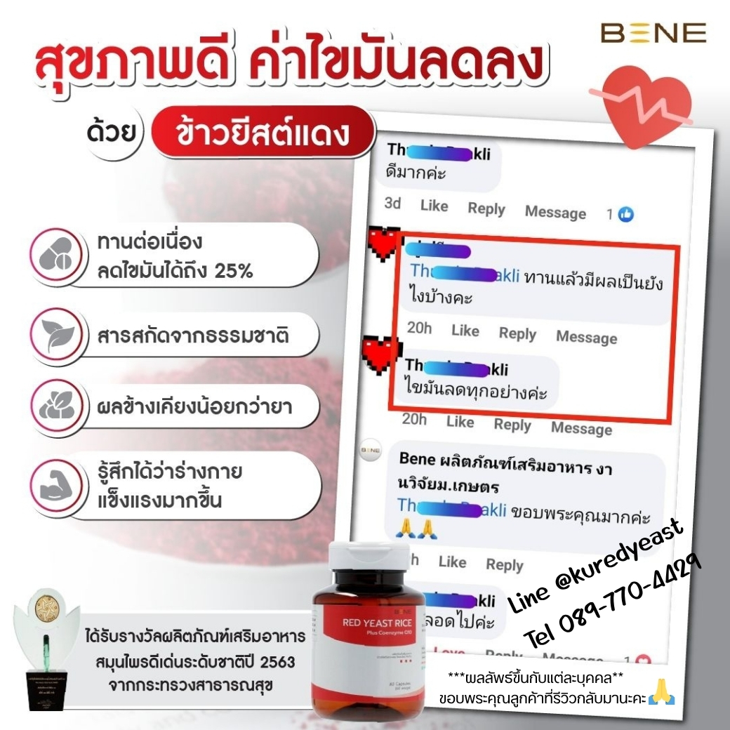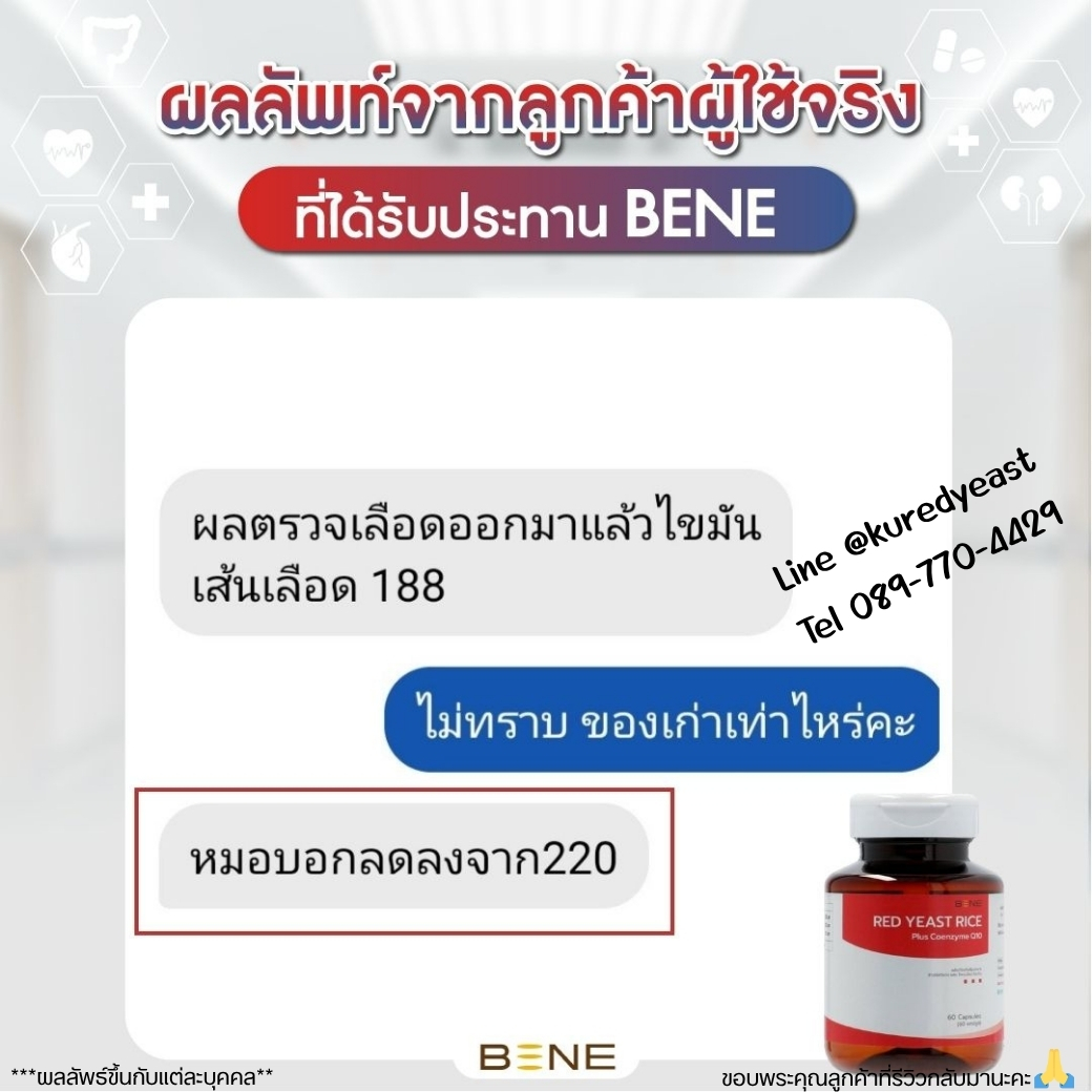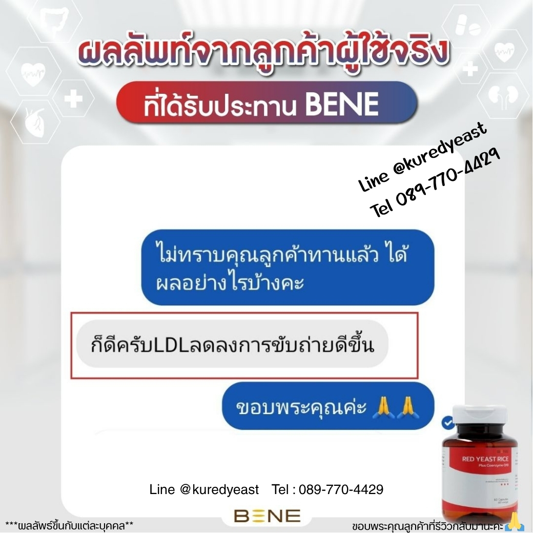 ผลตรวจเลือดของลูกค้าที่ทานข้าวยีสต์แดง เปรียบเทียบก่อนและหลังจากทานผลิตภัณฑ์แคปซูลข้าวยีสต์แดง ได้ 5 เดือน พบว่า ไขมันคอเลสเตอรอลลดลง , ไขมันไตรกลีเซอร์ไรด์ลดลง , ไขมัน LDL ลดลง