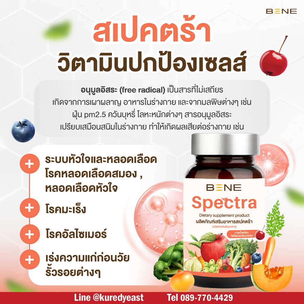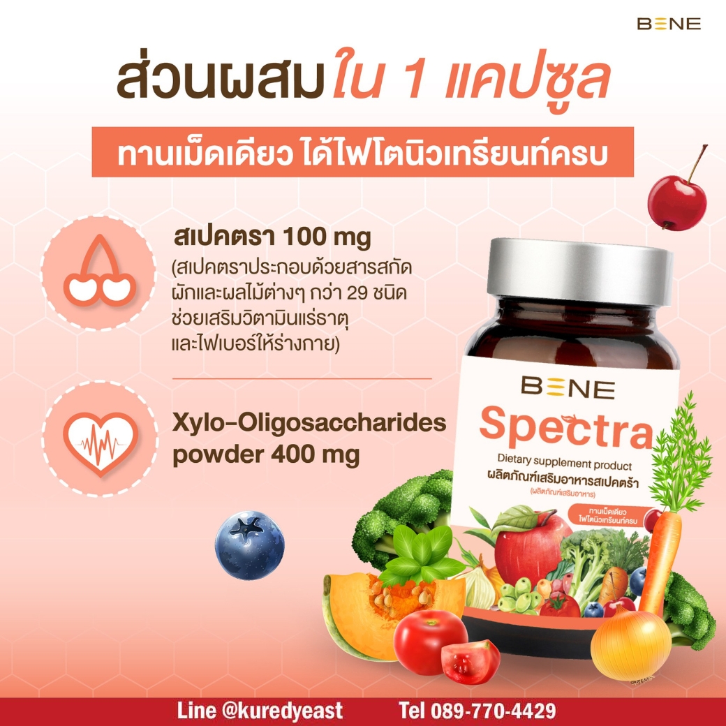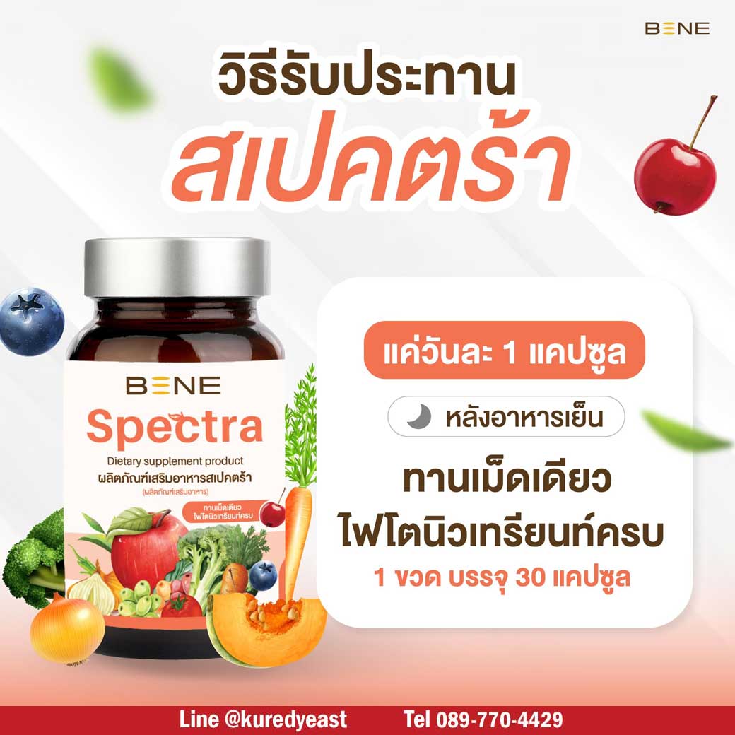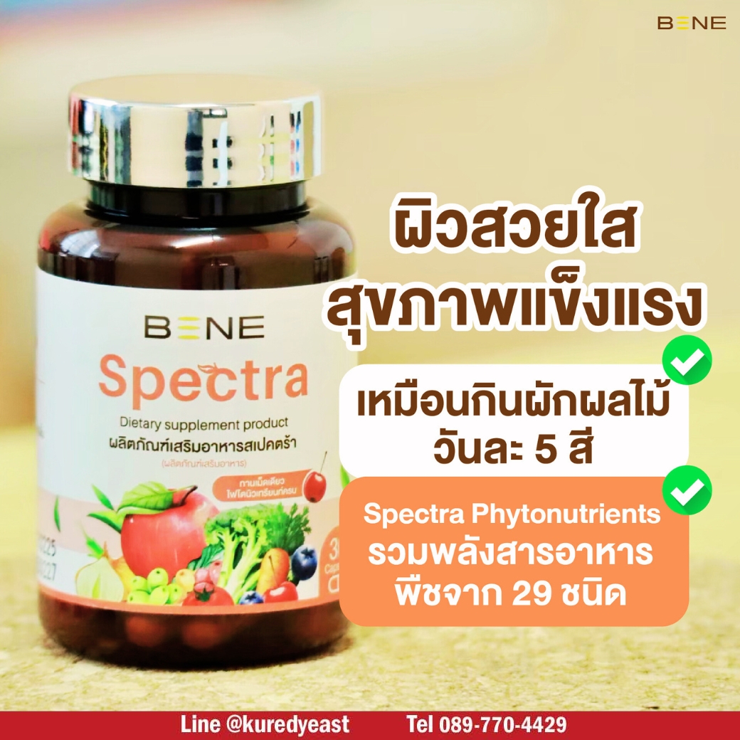 BENE Spectra เป็นผลิตภัณฑ์เสริมอาหารช่วยบำรุงร่างกาย มีไฟโตนิวเทรียนท์ ช่วยต้านอนุมูลอิสระ เสริมภูมิ บำรุงเซลล์ ผิวแข็งแรง ไม่โทรมง่าย สุขภาพดี เริ่มที่การดูแลตัวเองแบบง่ายๆ เพียงทานวันละ 1 แคปซูล จะได้รับสารต้านอนุมูลอิสระ เทียบเท่าการทานผัก ผลไม้ 29 ชนิด ในปริมาณมากถึง 400-500 กรัม