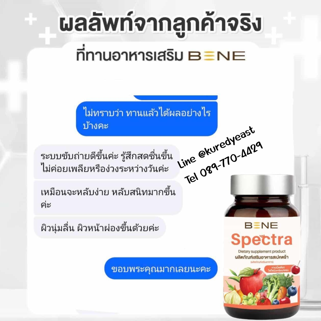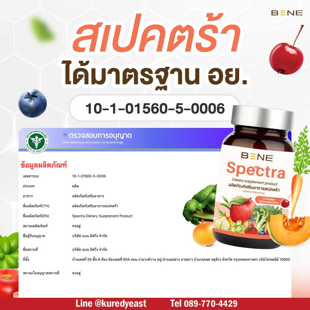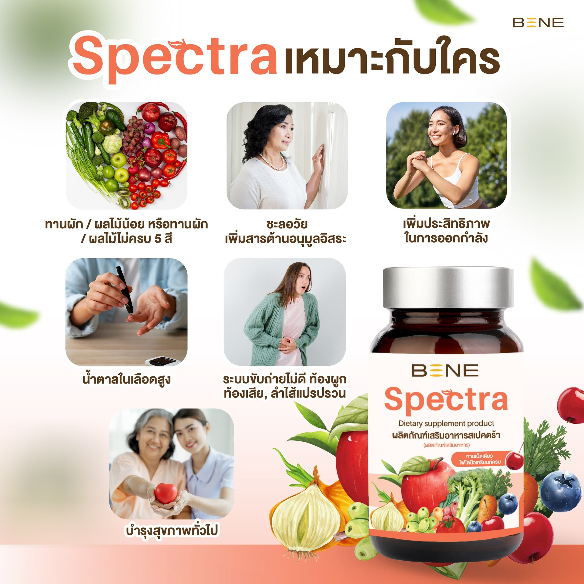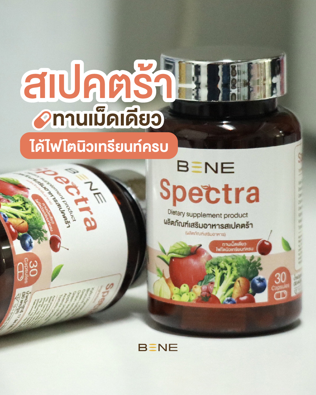 BENE Spectra เป็นผลิตภัณฑ์เสริมอาหารช่วยบำรุงร่างกาย มีไฟโตนิวเทรียนท์ ช่วยต้านอนุมูลอิสระ เสริมภูมิ บำรุงเซลล์ ผิวแข็งแรง ไม่โทรมง่าย สุขภาพดี เริ่มที่การดูแลตัวเองแบบง่ายๆ เพียงทานวันละ 1 แคปซูล จะได้รับสารต้านอนุมูลอิสระ เทียบเท่าการทานผัก ผลไม้ 29 ชนิด ในปริมาณมากถึง 400-500 กรัม