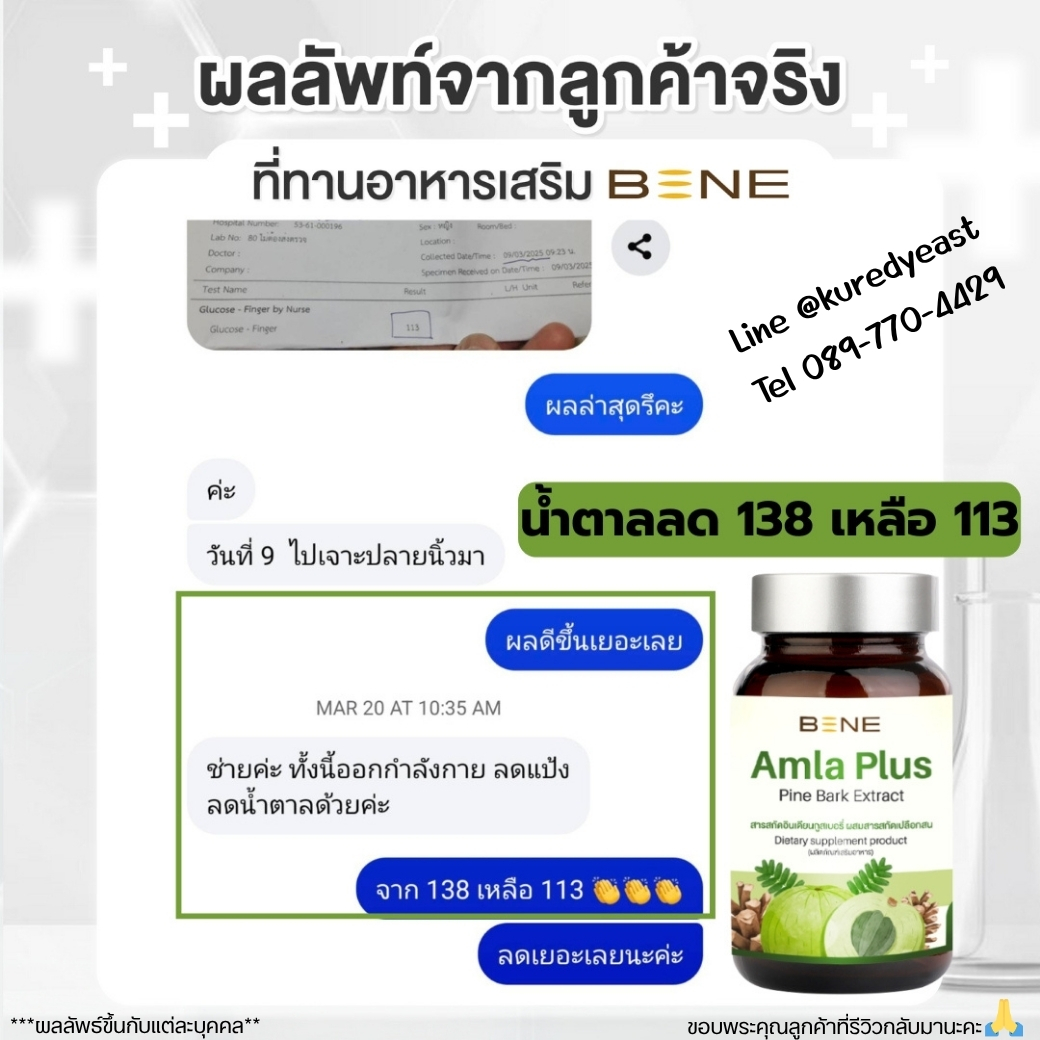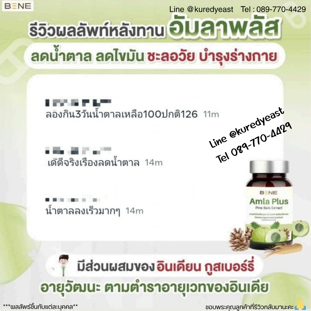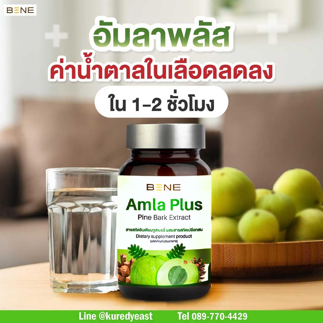 ผลิตภัณฑ์อัมลาพลัส Amla Plus จาก BENE มีส่วนผสมของสารสกัดมะขามป้อมอินเดียจากประเทศอเมริกา ช่วยให้ค่าน้ำตาลในเลือดลดลง ระบบไหลเวียนโลหิตดีขึ้น ไม่เหนื่อยง่าย นอนหลับง่าย สารแทนนินสูงกว่าผงมะขามป้อม เหมาะสำหรับผู้ที่มีน้ำตาลในเลือดสูง เป็นตัวช่วยสำหรับผู้ที่ชอบทานของหวาน ผู้ที่มีความดันในเลือดสูง คนทั่วไปที่ต้องการบำรุงผิวพรรณ ชะลอวัย ทั้งยังช่วยบำรุงสมองอีกด้วย