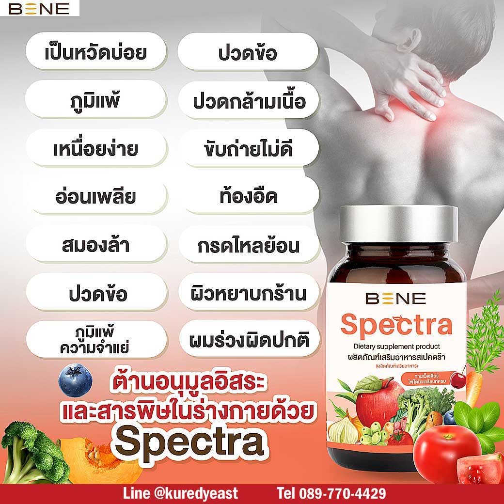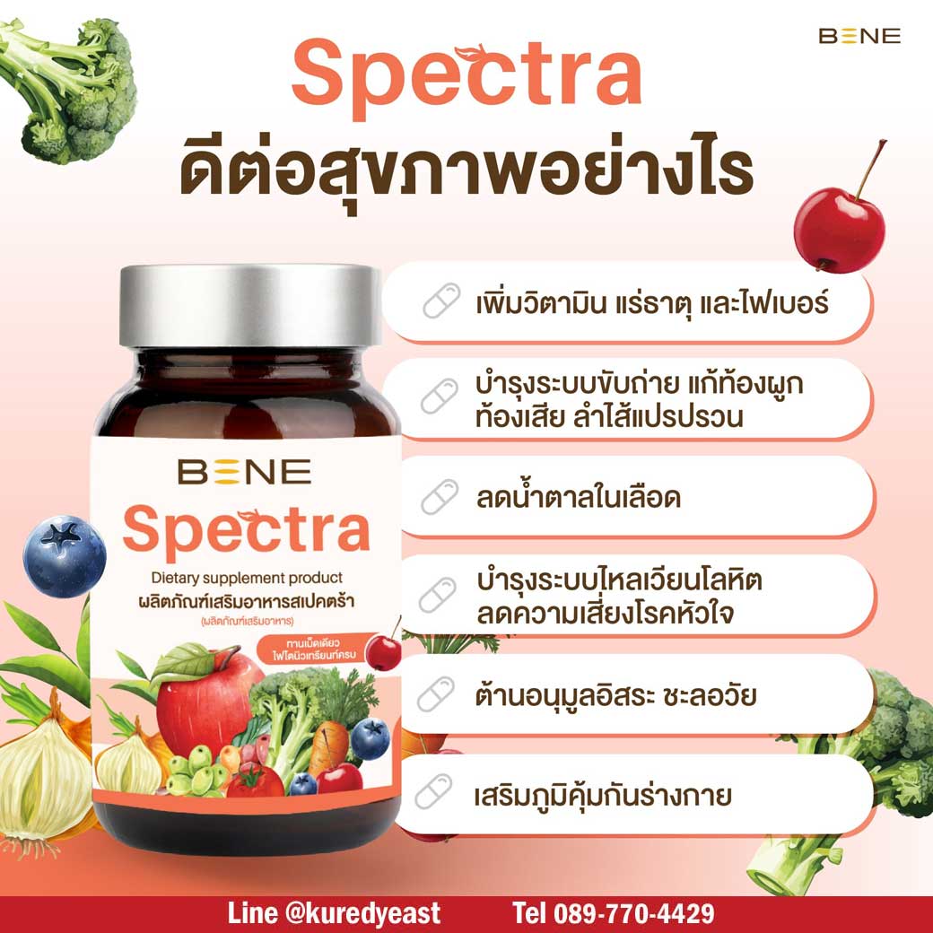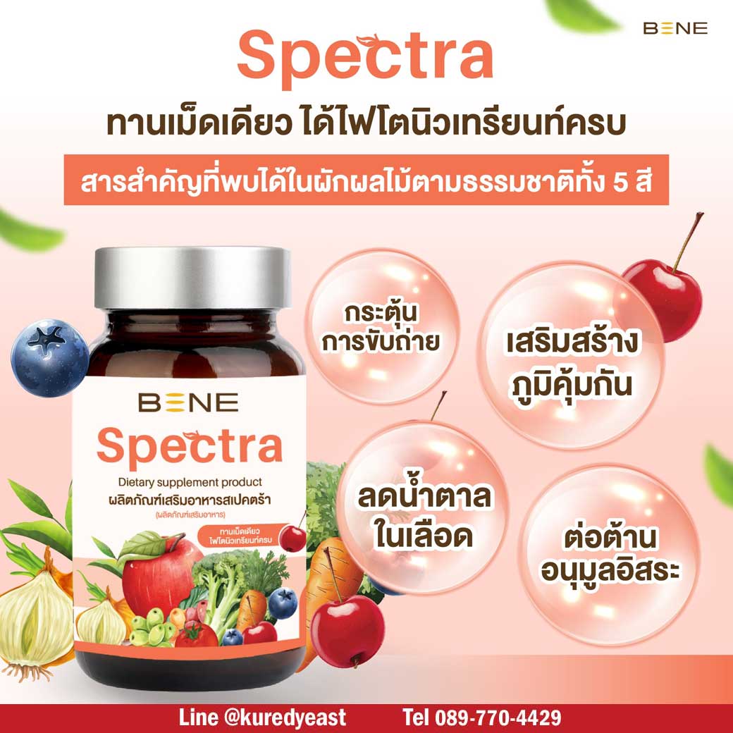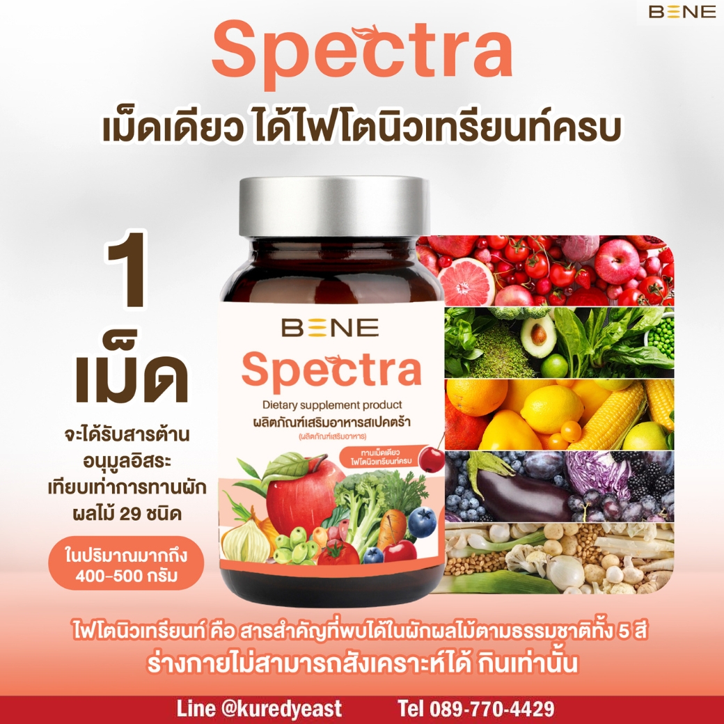 ผลิตภัณฑ์สเปคตร้า Spectra จาก BENE มีสารอาหารไฟโตนิวเทรียนท์ครบ อุดมไปด้วยสารต้านอนุมูลอิสระ ทานเม็ดเดียว เหมือนทานผักผลไม้ครบทั้ง 5 สี ช่วยกระตุ้นการขับถ่าย ลดน้ำตาลในเลือด เสริมสร้างภูมิคุ้มกัน เหมาะสำหรับผู้ที่ทานผัก/ผลไม้น้อย ผู้ที่ระบบขับถ่ายไม่ไดี ผู้ที่ต้องการชะลอวัย ช่วยเพิ่มประสิทธิภาพในการออกกำลังกาย ดูแลน้ำตาลในเลือด รวมถึงผู้ที่ต้องการบำรุงสุขภาพทั่วไป สามารถทานได้